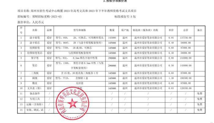 鄭州市招生考試中心購(gòu)置2023年高考文具和2023年下半年教師資格考試文具項(xiàng)目報(bào)價(jià)信息 圖片來(lái)源:河南省政府采購(gòu)網(wǎng)